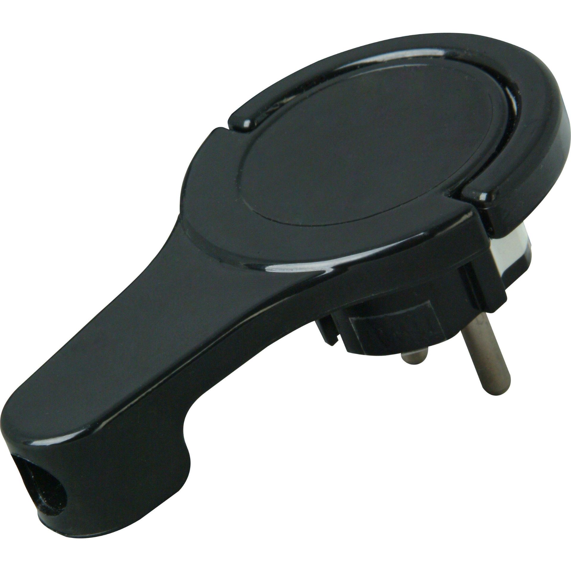 Ficha angular C/ Terra plástico, extra plano (8mm), entrada de cabo na lateral para CEE 7/VII, até 3×1,5mm², cor: preto