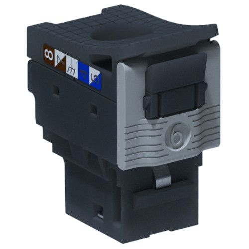Conector Keystone RJ 45 sem ferramentas. Permite instalar condutores monofilar ou multifilar AWG 23 a AWG 26. Contatos marcados com código de duas cores para esquemas de ligação T 568 A e T 568 B. Em conformidade com os padrões ISO / IEC 11801, ANSI / TIA 568 e EN 50176