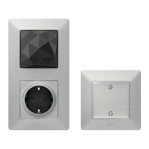 1 tomada de energia com gateway integrada de 16 A máx. 3680 W + 1 comando geral entrar/sair sem fios. Fornecido com suportes, quadros e capas de proteção para obra.