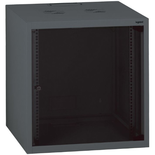 IP 20 - IK 08. Quadros murais com porta frontal reversível. Porta frontal plana em vidro de segurança. Fixação mural simplificada em 2 etapas: base + quadro. Fornecido com 2 montantes de 19” reguláveis em profundidade. Painéis com ligação equipotencial automática. Equipamentos dos quadros LCS2 são compatíveis, exceto os acessórios guia cabos com anéis. Parte superior com grelha para ventilação natural, pode receber o kit de ventilação ref. 6 462 38. Antracite: RAL 7016.